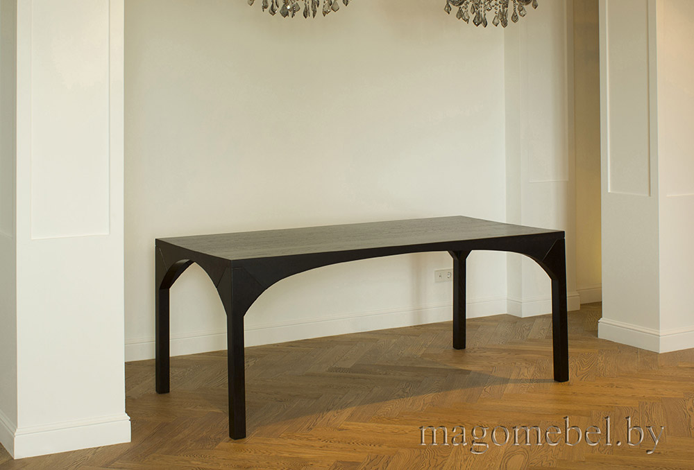 Данный обеденный стол выполнен из массива дерева. Прочный материал позволяет использовать тонкую столешницу без потери надежности всей конструкции. Особенностью этой модели являются арочные изгибы, равномерно распределяющие нагрузку на ножки и придающие столу необычный внешний вид.