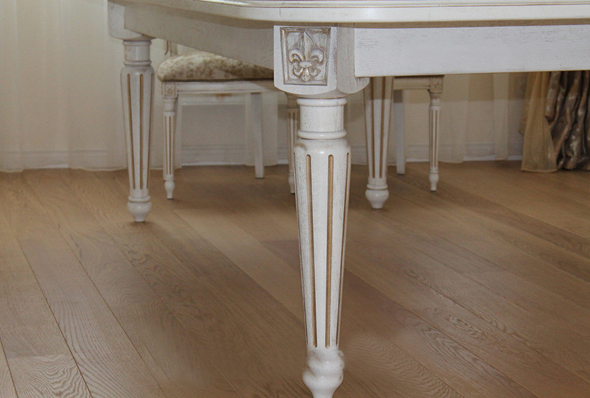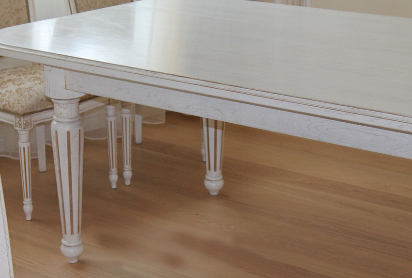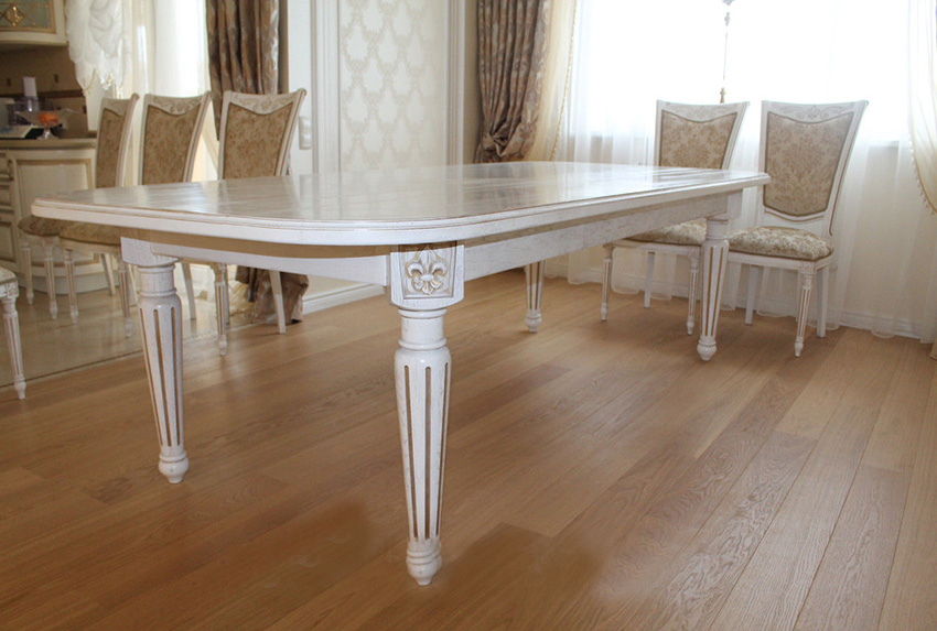 Стол, выполненный из массива дуба, покрыт белоснежной эмалью. Элементы декора, украшающие модель, покрыты золотистой патиной. Стол вместительный и будет превосходно смотреться в любом из выбранных интерьеров.