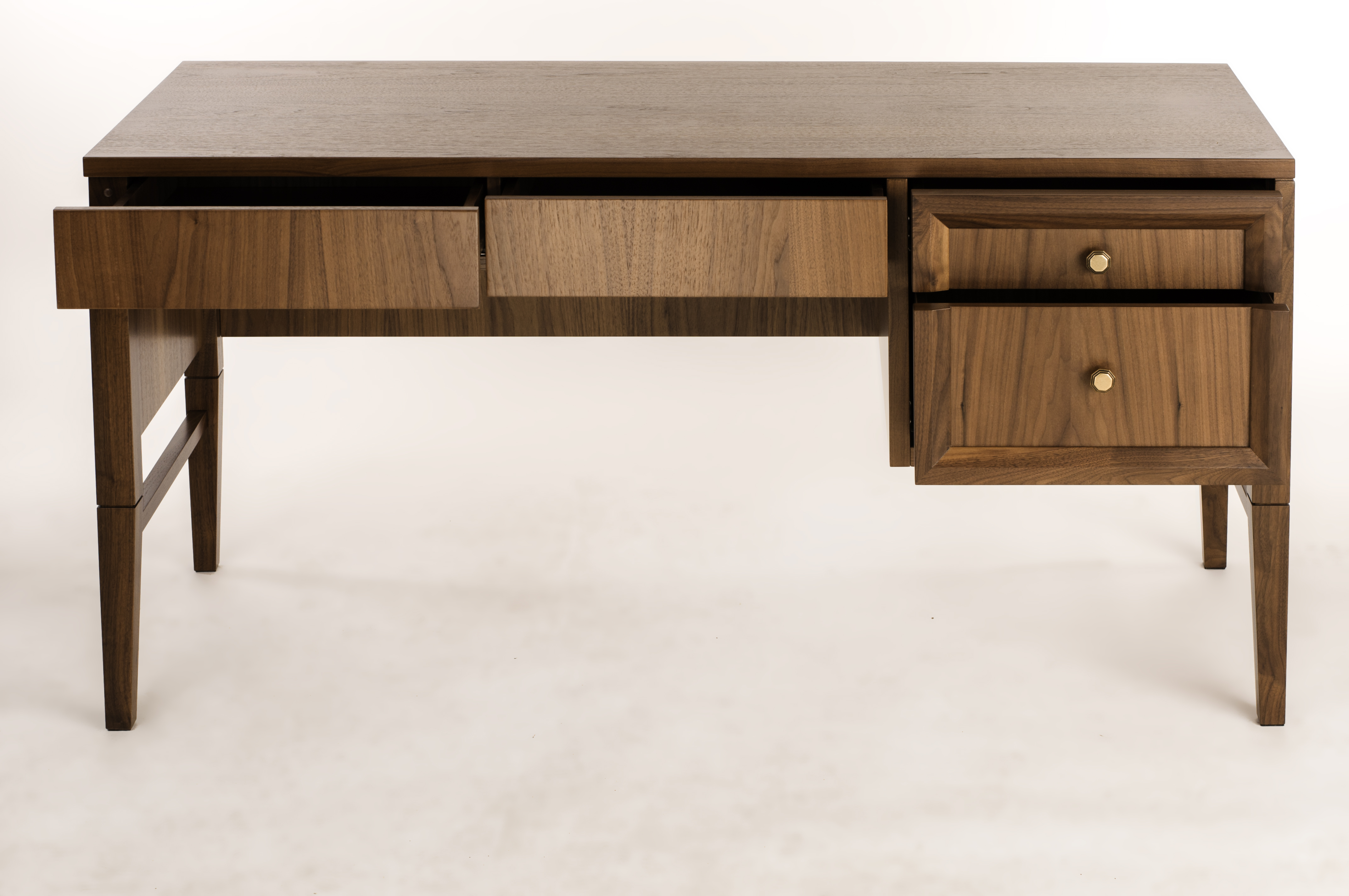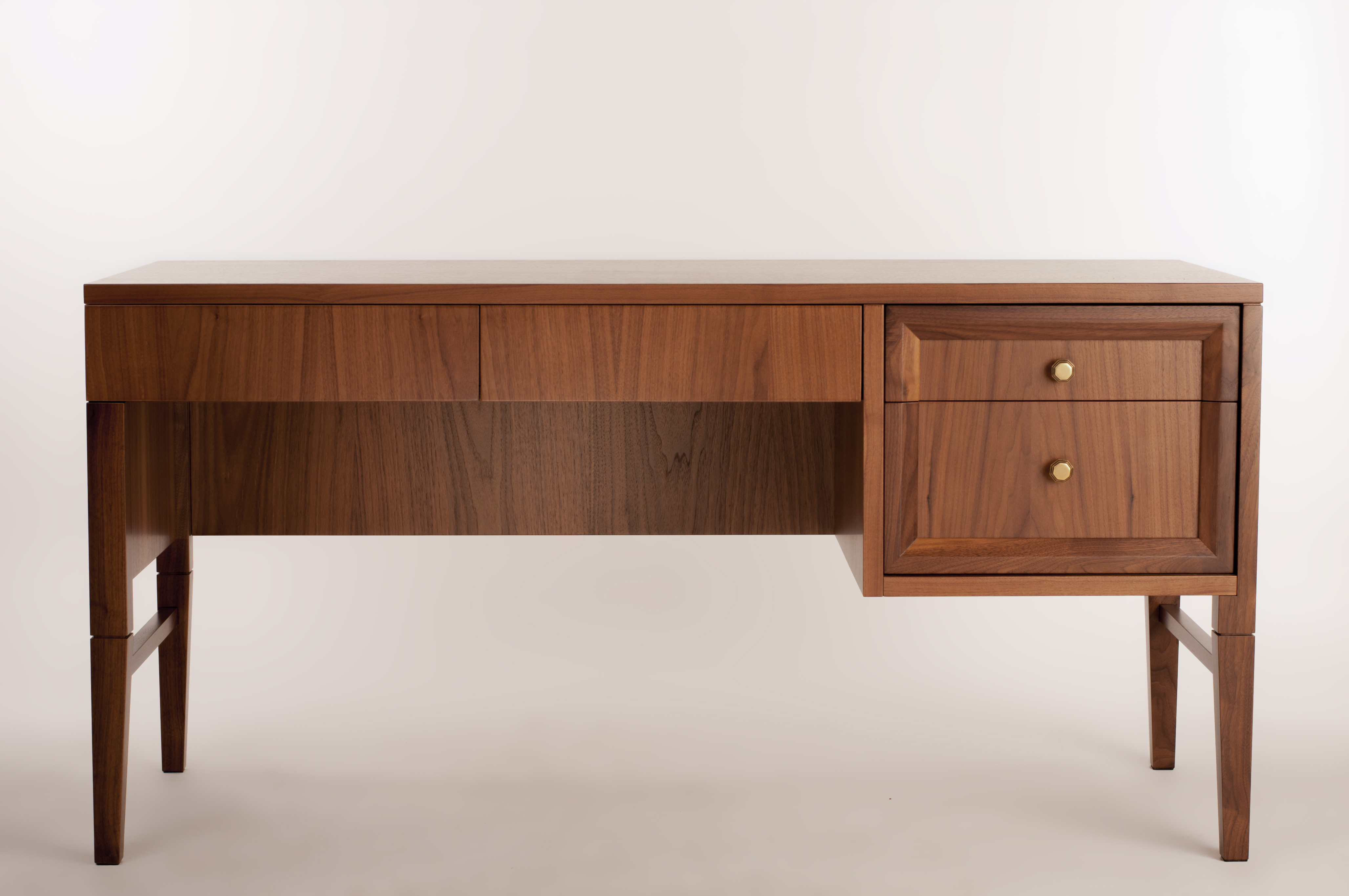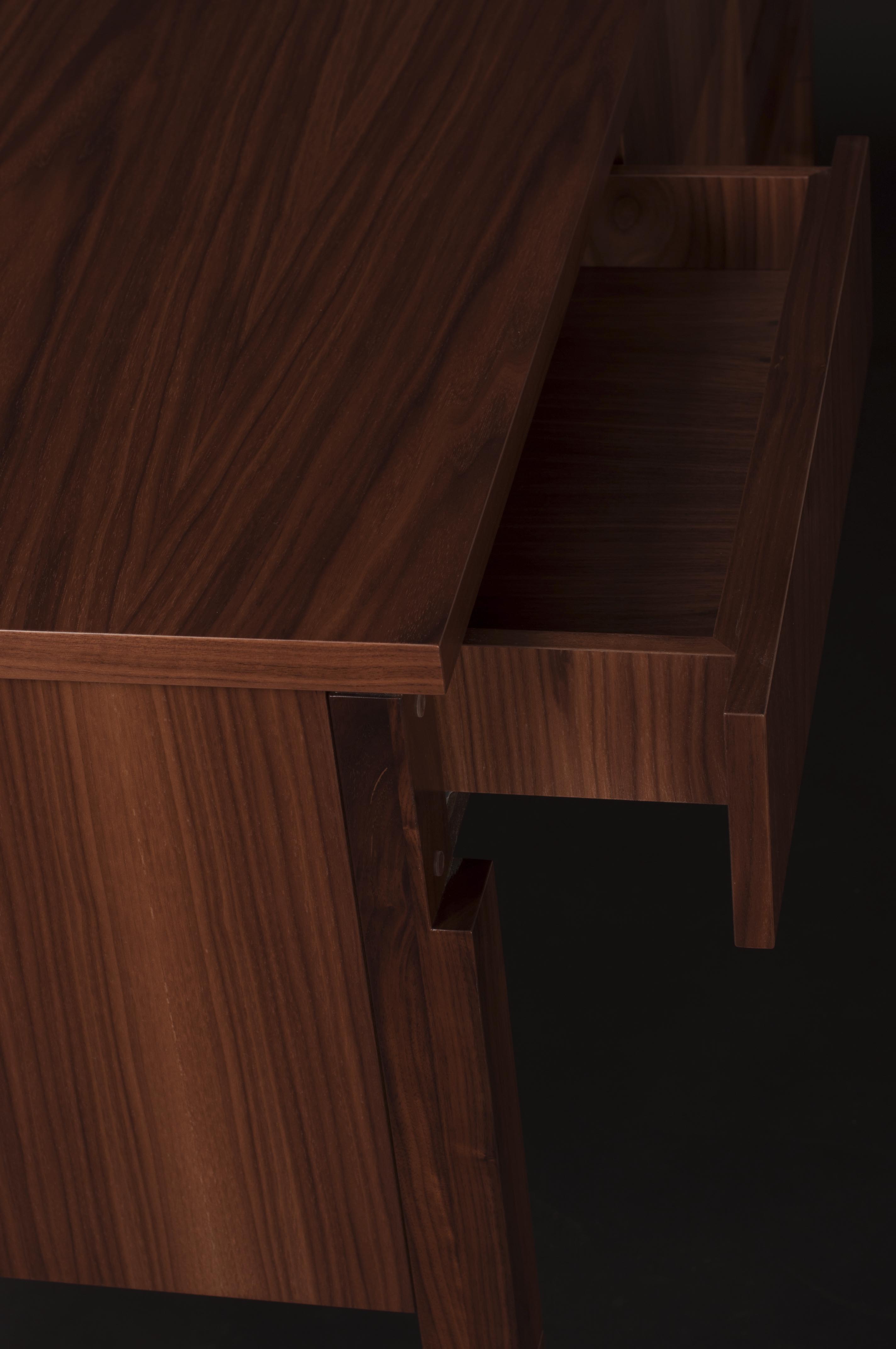 Изысканный письменный стол способен органично дополнить интерьер рабочего кабинета. Выполненный из массива ореха и качественного МДФ, стол практически не подвержен износу, потому он будет служить длительный срок. Ящики стола оснащены фурнитурой Blum для бесшумного выдвижения.