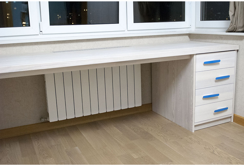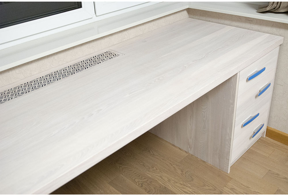 Данная конструкция предназначается для установки вплотную со стеной, что позволяет создать рабочую поверхность большой площади. В качестве основного материала при изготовлении стола используется натуральный массив ясеня. Светлый и приятный дизайн модели без труда впишется в окружающую обстановку, делая ее уютнее и привлекательнее.