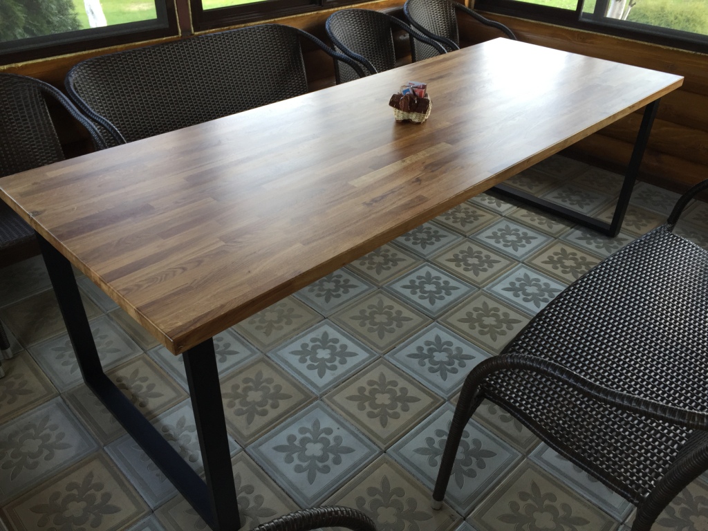 Деревянный ЦЕЛЬНО и ШИРОКО ламельный стол из дуба с ЖИВЫМ КРАЕМ на металлическом подстолье серии V