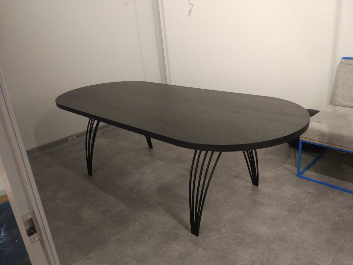 Стильный стол обвальной формы, изготовлен из высококачественного массива, выполнен в нейтральном черном цвете. Главная особенность модели - ножки, каждая из них состоит из пяти изогнутых ножек меньшего размера сходяшихся в одну.