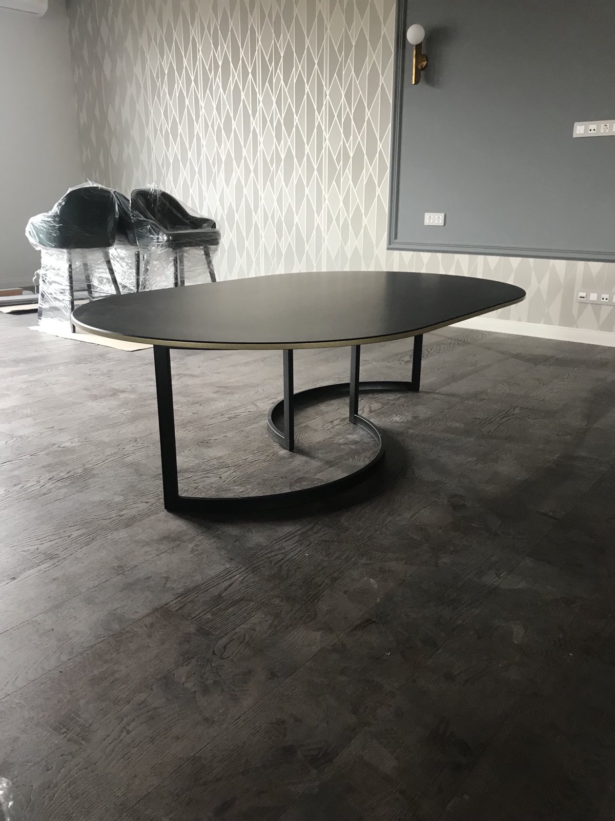Современный стол из массива овальной формы. Столешница небольшой толщины, черного цвета с бежевой кромкой. Подойдет для размещения как на кухне так и в гостиной. Основная особенность модели, выделяющая ее из ряда других - опоры необычной, изящной формы.