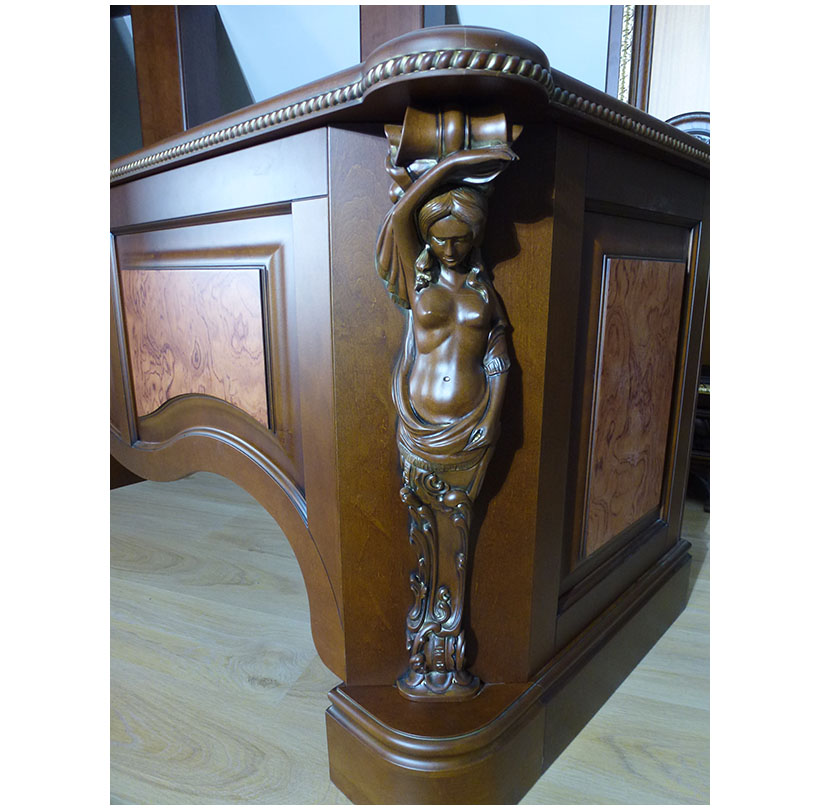 Данная модель письменного стола выполнена в классическом стиле, и отличается наличием большого количество вставок декоративного фрезерования. В качестве материала изделия используется натуральный древесный массив. Большая площадь поверхности столешницы позволяет комфортно заниматься всеми необходимыми делами, а также хранить большое количество документов в выдвижных ящиках.