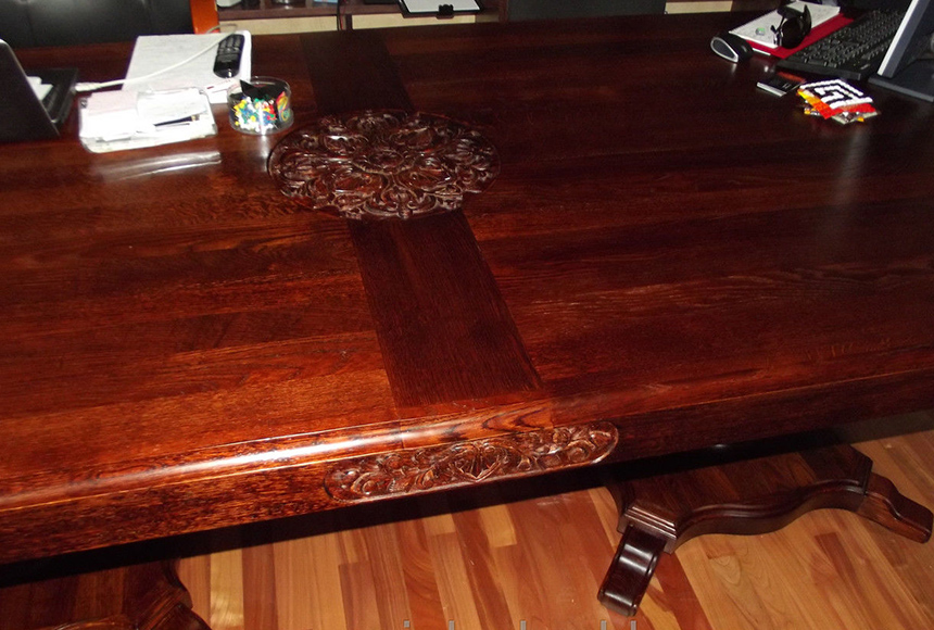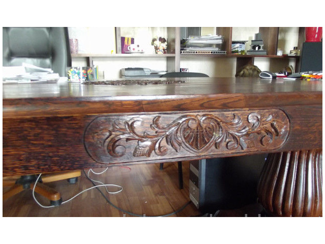 Данная модель стола, предназначенного для кабинета, выполнена из массива дуба под тонировкой. Роскошный стол из натуральной древесины украшен элементами резьбы, делающими внешний вид модели уникальным.