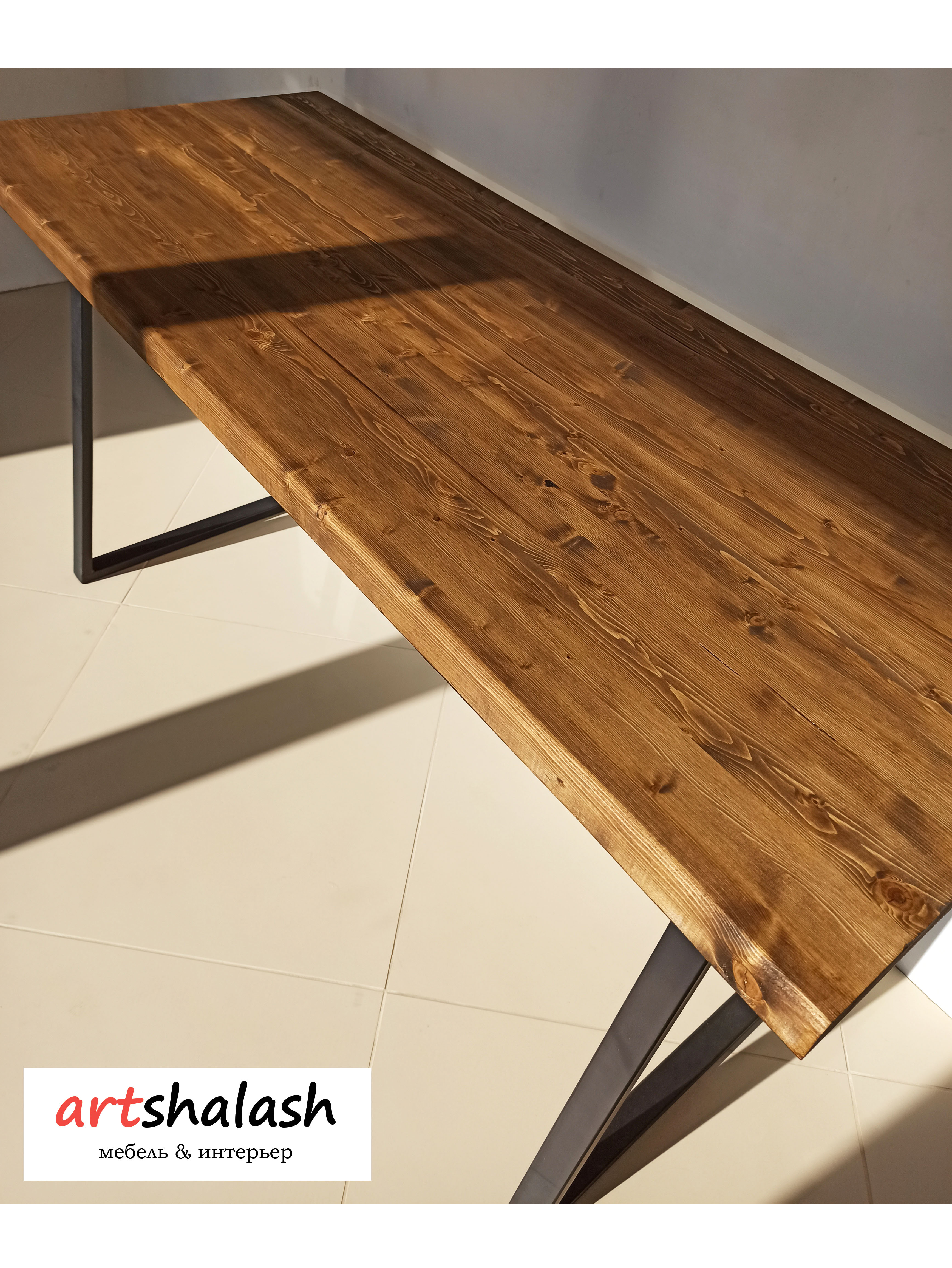 Деревянный ЦЕЛЬНО и ШИРОКО ламельный стол из дуба с ЖИВЫМ КРАЕМ на металлическом подстолье серии V
