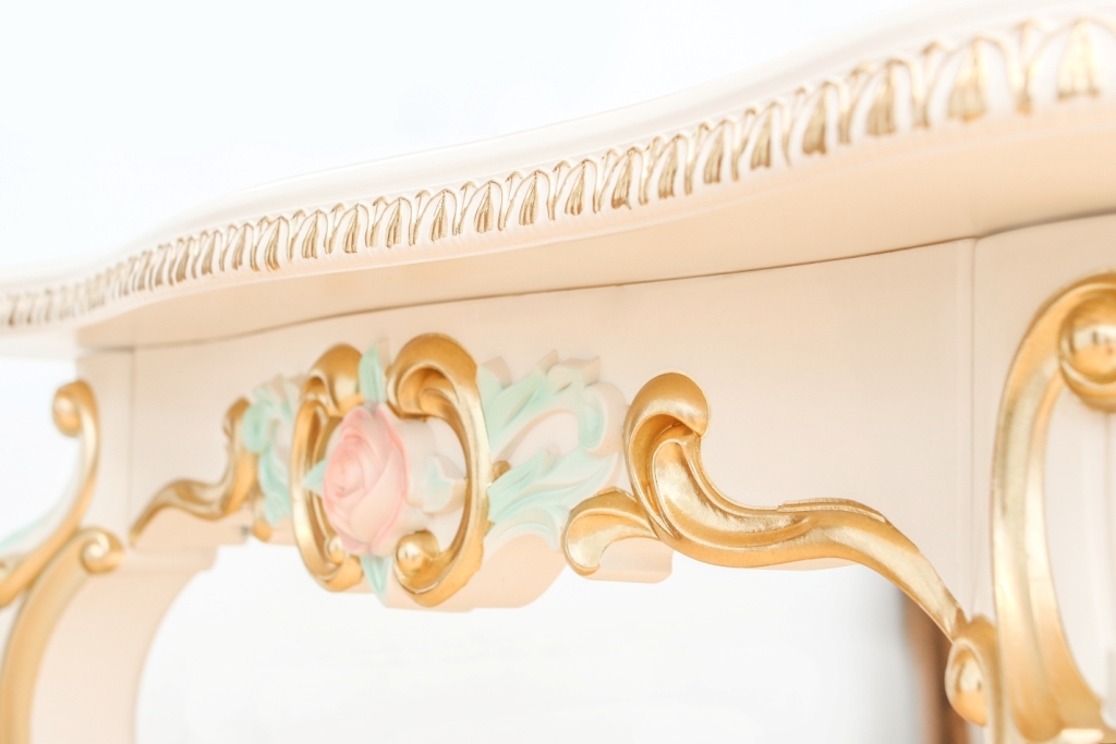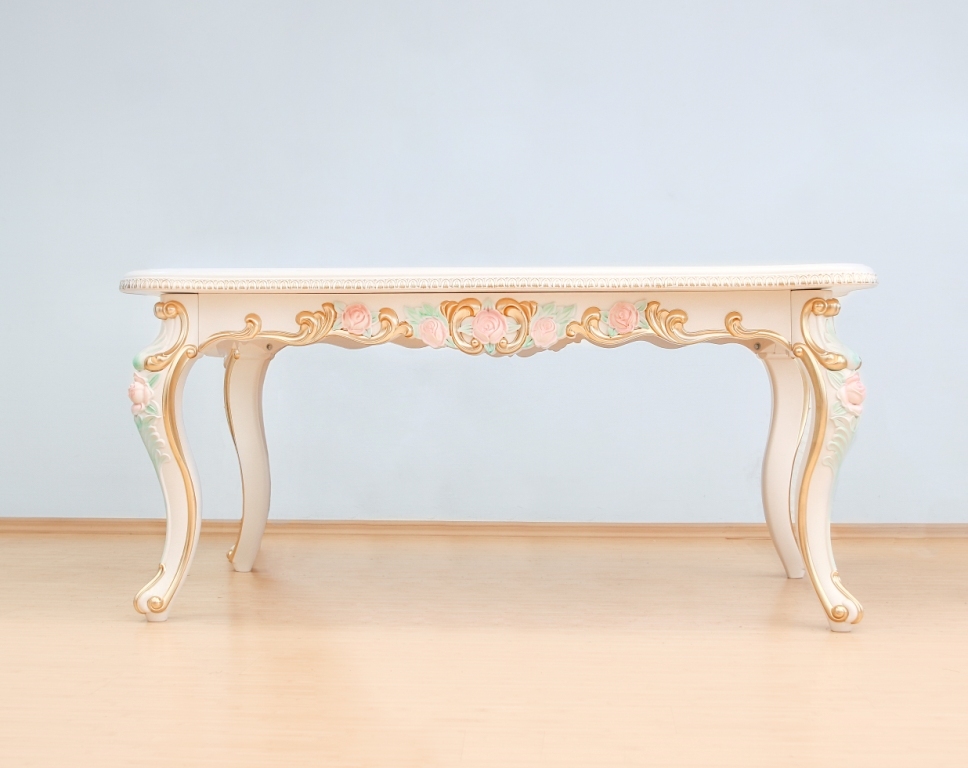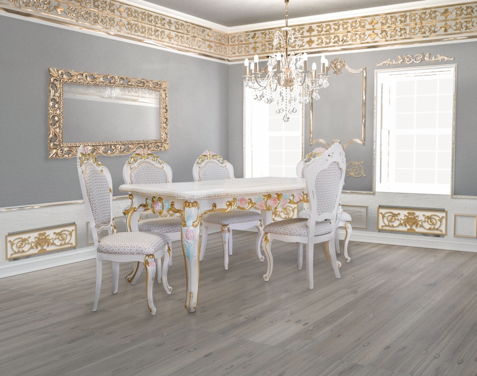 Просторный стол из массива выполненный в белом цвете, украшен золотыми узорами в классическом стиле и 3Д изображениями цветов. В комплекте идут пять стульев с качественной мягкой обивкой. Великолепный выбор для обустройства интерьера кухни.
