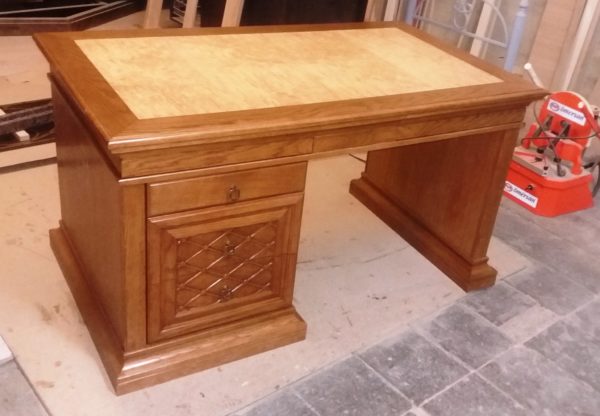 Классическая модель письменного стола выполнена из качественных натуральных материалов. В левой части конструкции присутствует массивная тумба с вместительными выдвижными ящиками. Большая столешница позволяет удобно располагать все необходимые предметы на столе. Изделие обработано специальным защитным составом, увеличивающим его долговечность.