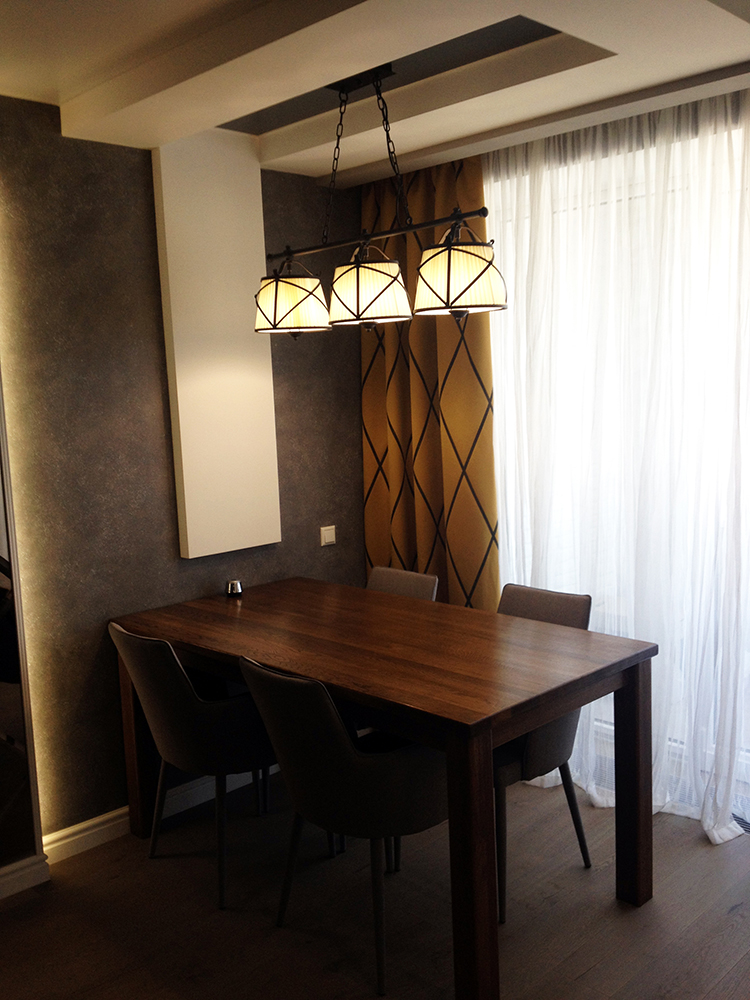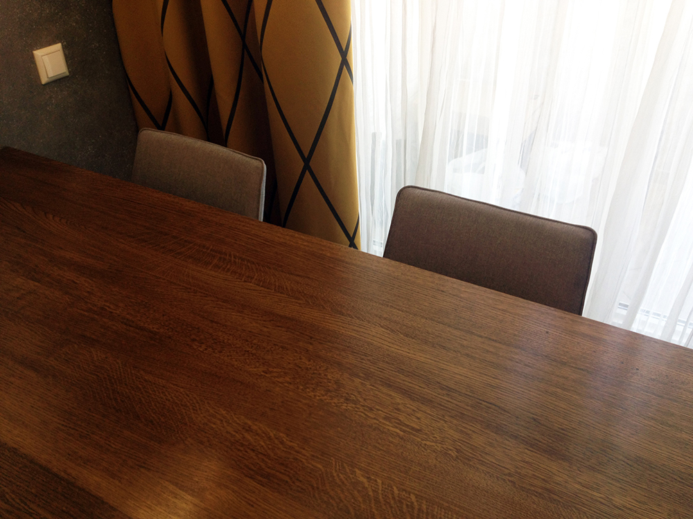 Представленный прямой стол выполнен из натурального массива дуба. Конструкция имеет лаковое темное покрытие, украшающее модель и придающее ему серьезный внешний вид. На фото цвет хх-08 в один слой цветного масла и три слоя защитного масло-воска.