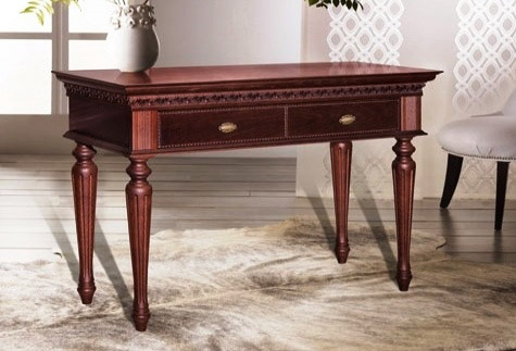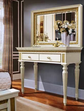 Компактный туалетный столик дополнит интерьер любой спальни. Конструкция не занимает много места, и может использоваться даже в самых малогабаритных комнатах. Классический дизайн модели изобилует фигурной резьбой и декоративными вставками позолоты. Для хранения необходимых принадлежностей предусмотрена пара выдвижных ящиков под столешницей.