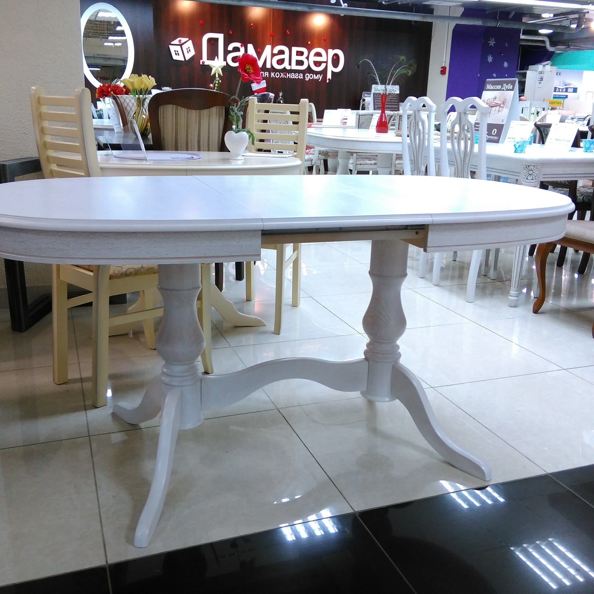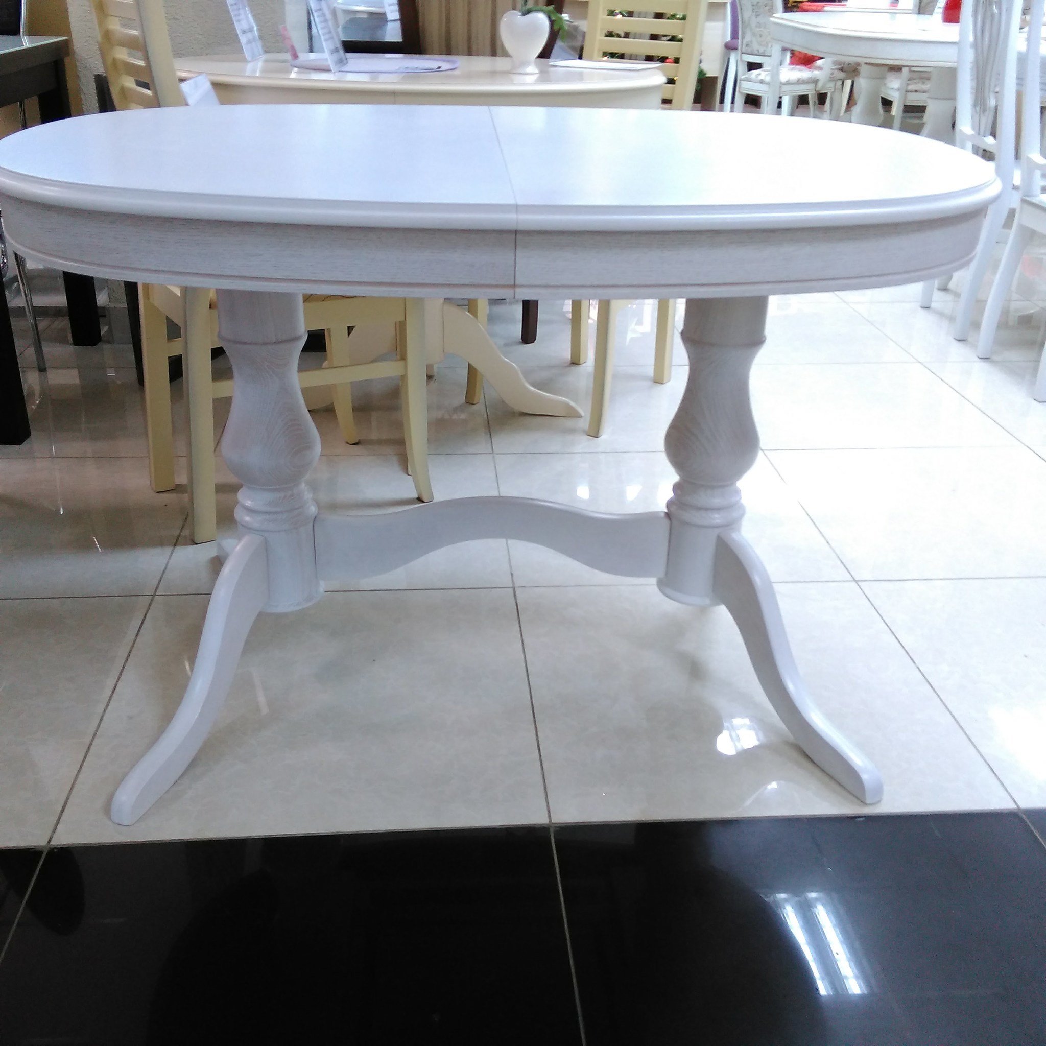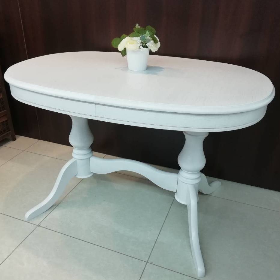 Овальный обеденый стол с синхронно-раздвижным механизмом раскладывания. Благодаря универсальному белому цвету и классическому дизайну данная модель удачно впишется практически в любой интерьер. Столешница выполнена из шпона дуба.