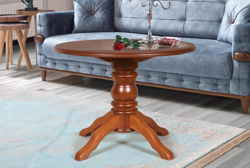 Журнальный столик «Ольга» оснащен удобной столешницей круглой формы, выполненной из качественной ДСП. Ножки конструкции изготовлены из натурального дерева (массив ольхи) и придают конструкции невероятную устойчивость и стильный внешний вид.