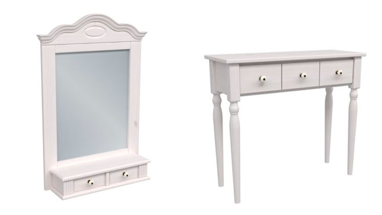 Туалетный столик «консолея-3» оснащен тремя выдвижными ящичками. Основанием конструкции служат четыре высокие фигурные ножки. Столик идет в комплекте с зеркалом «Синди» с двумя выдвижными ящичками. Гарнитур выполнен в цвете белого воска.