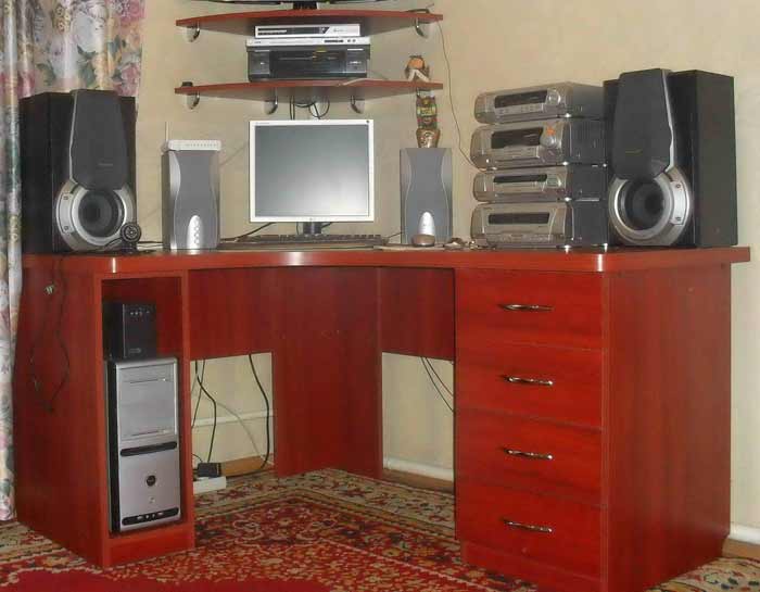 На широкой столешнице, сделанной из ДСП под красное дерево, найдется место не только для компьютера. Здесь можно также разместить объемный магнитофон, останется место и для рабочего процесса. К тому же толщина в 36мм гарантированно выдержит большие весовые нагрузки на поверхность компьютерного стола.