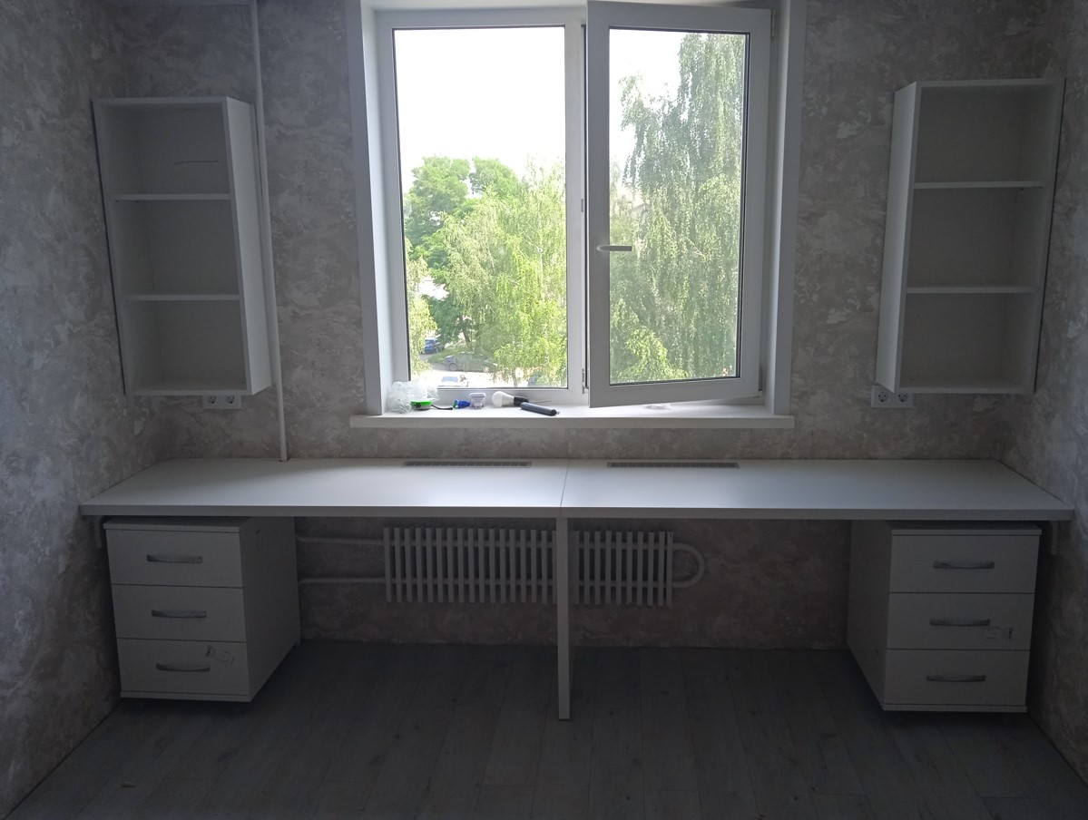 Широкий стол с большим количеством ящиков