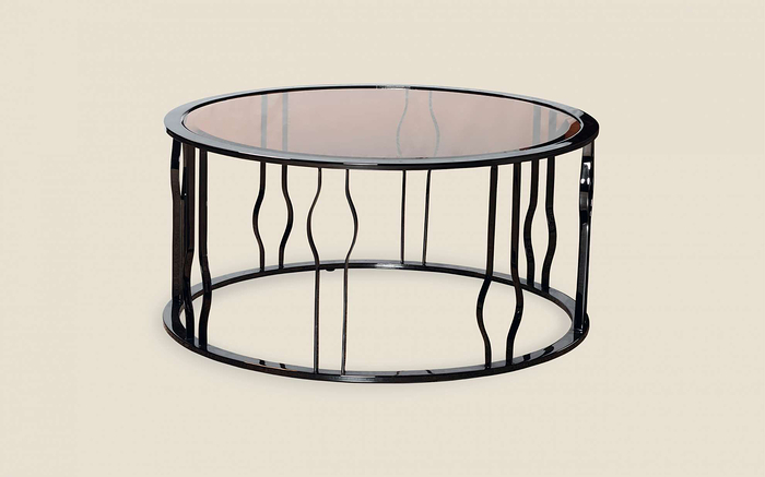 Круглый журнальный столик -диаметр 91,4 см ,высота 44,5 см. Одно и то же кольцо основания соответствует дну, и оба соединены стержнями, проходящими по окружности. Сталь покрыта слоем черного никеля, столешница столика - прозрачное стекло коричневого цвета, скошенное по краю. Отлично будет смотреться в паре с маленьким журнальным столиком TARO - диаметр 60 см, высота 58,4 см.