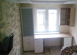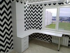 Рабочее место в комнате подростка. Мебель изготовлена из ЛДСП. Комплектация - стол, тумба, стеллаж.