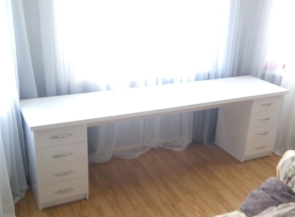 Очень стильный и многофункциональный стол имеет удобную и длинную столешницу белого цвета установлен на тумбы, оснащенные выдвижными ящиками с элегантной фурнитурой. На фото модель установлена напротив окна, что позволяет немного закрыть батарею, как одна из идей обстановки интерьера.
