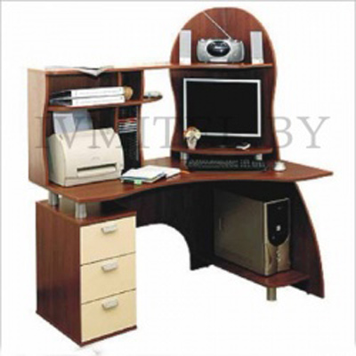 Компьютерный стол отличается своей функциональностью и приятным дизайном. Столешница выполнена с закруглением, имеется подставка для монитора. Приставная тумба с белым фасадом имеет три выдвижных ящика.