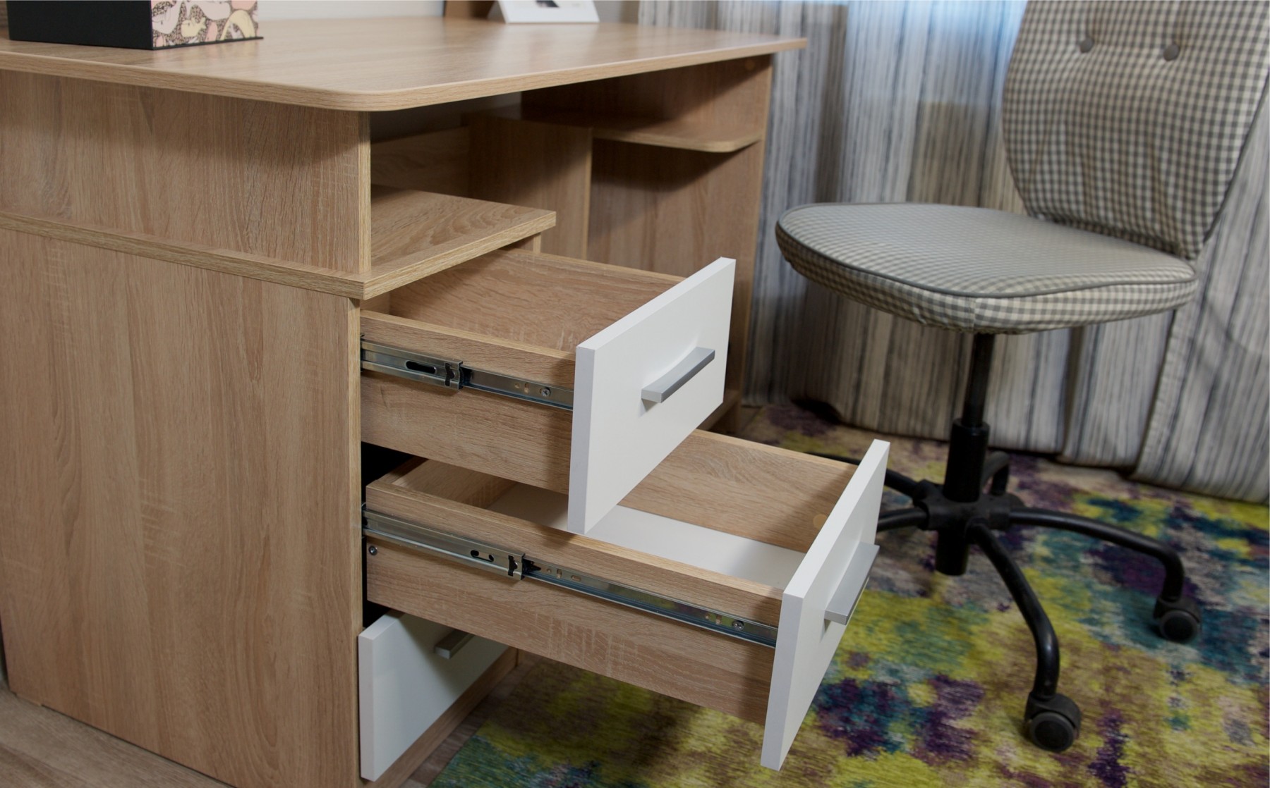 Рабочее место в комнате подростка. Мебель изготовлена из ЛДСП. Комплектация - стол, тумба, стеллаж.