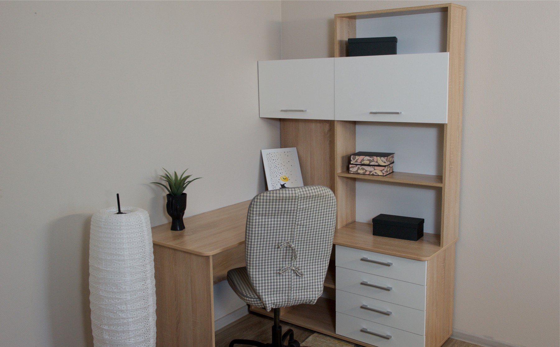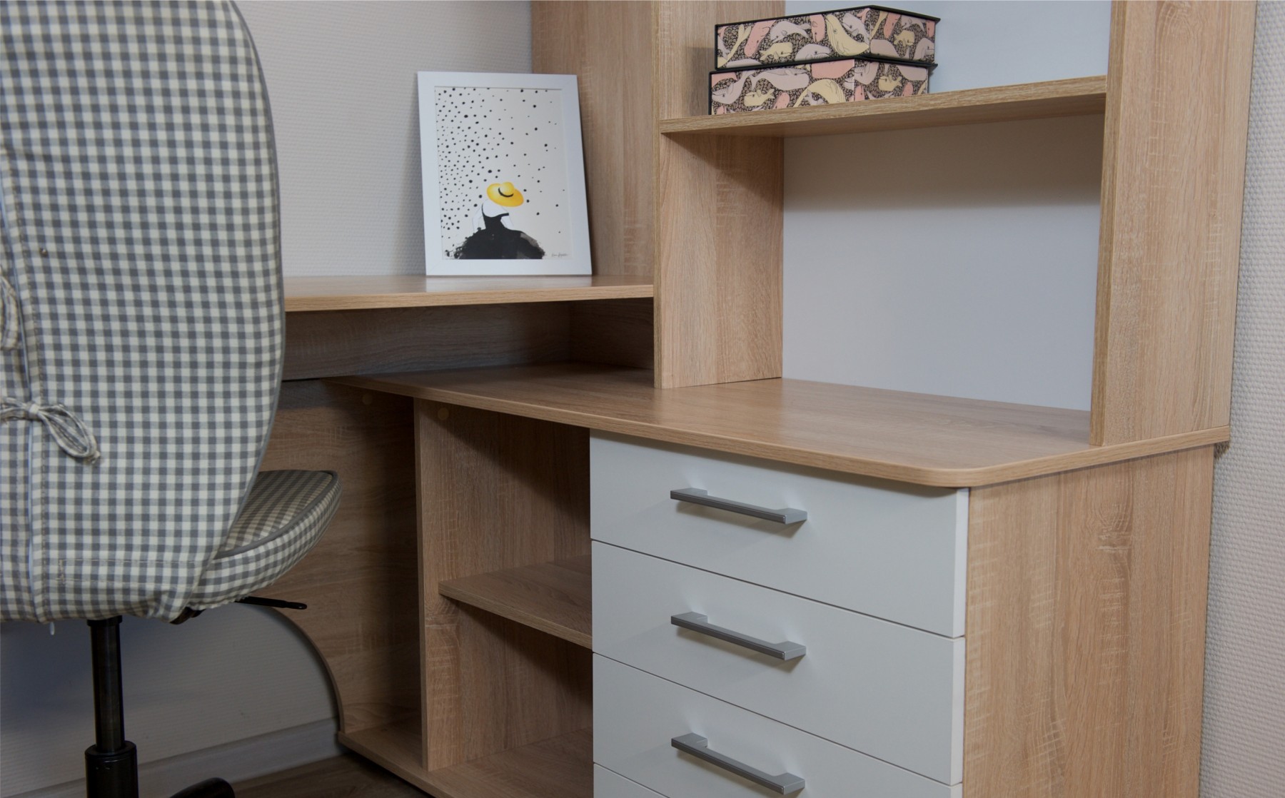 Комплект для детской из двух удобных угловых рабочих столов и вместительных стеллажей.