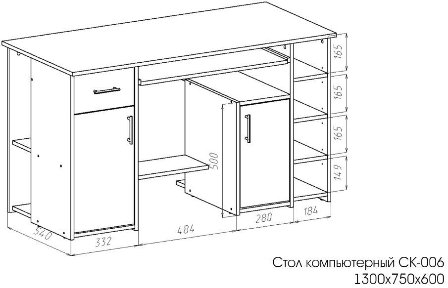 Данную модель возможо использовать как в качестве письменного, так и в качестве компьютерного стола. Компьютерный стол «СК-006» дополнена местом для системного блока, оснащена выдвижной полкой для клавиатуры и мыши, имеет большое количество открытых и закрытых ниш для хранения вещей. Для изготовления были использованы только качественные материалы и надёжная фурнитура, что обеспечивает комфорт и долговечность в процессе эксплуатации. Широкая цветовая палитра делает изделия универсальными для любой комнаты и интерьера.