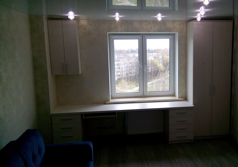 Угловой широкий стол. Подсветка полок. Можно дополнить кроватью-трансформер.