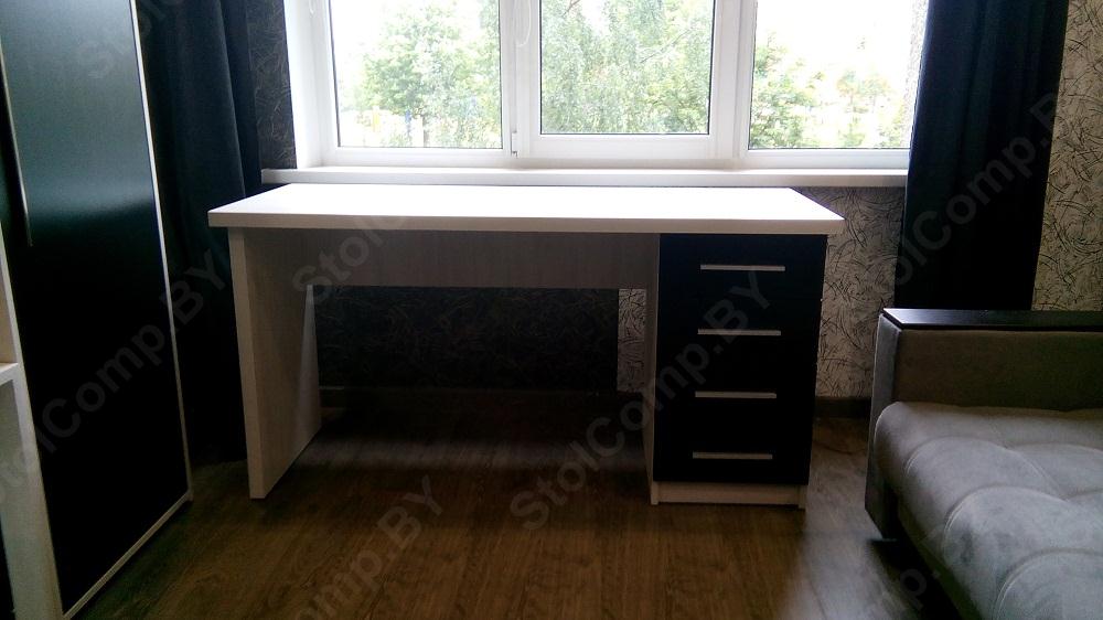 Письменный рабочий стол в массивном корпусе ламинирован под светлое дерево, в основании расположена тумба на четыре выдвижных ящика с черными матовыми крышками и металлическими ручками.