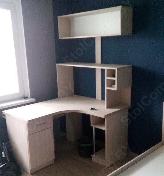 Небольшой угловой стол оборудован тумбой, нишами для системного блока и монитора компьютера с небольшими полками.