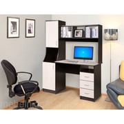 Компьютерный стол CK 88 оснащен навесными шкафчиками, отличающимися вместимостью. Здесь также имеются две открытые полки. Стол оборудован небольшой подставкой под монитор. Корпус стола и шкафчиков выполнен в цвете венге, а фасады и столешница выкрашены в бежевый цвет.