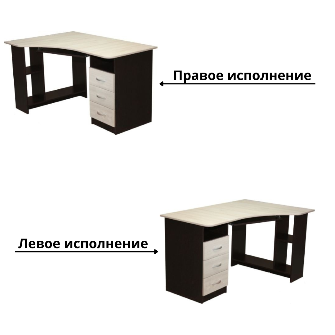 Основа стола - большая, эргономичная, закругленной формы столешница с выдвижной полкой для клавиатуры под ней. Под столешницей расположены c одной стороны - тумба с тремя выдвижными ящиками и открытой нишей, с другой стороны - открытые полочки. Тумба - царство канцелярии и деловых бумаг, а полочки образуют нишу для системного блока и папок. Всё необходимое будет буквально «под рукой».