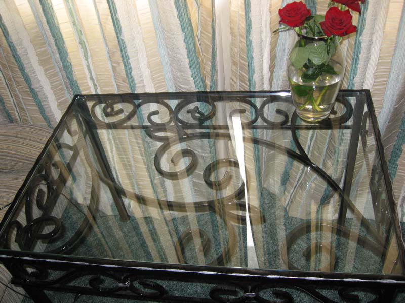 Представленная модель кованого журнального столика подойдет для гостиной или спальной комнаты в классическом стиле. Столешница стола изготовлена из прозрачного стекла. Каркас изделия представляет собой кованое основание с вставками витиеватой формы черного цвета.