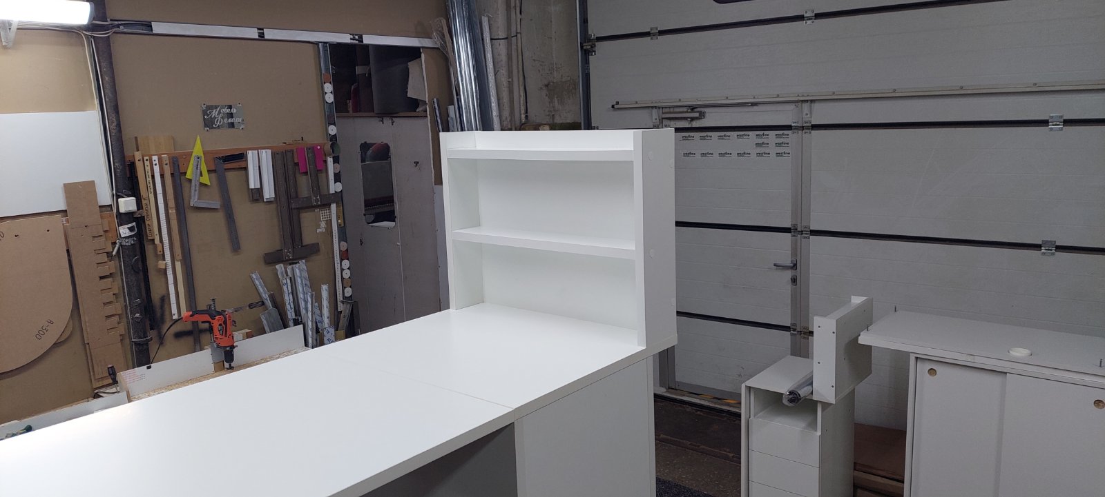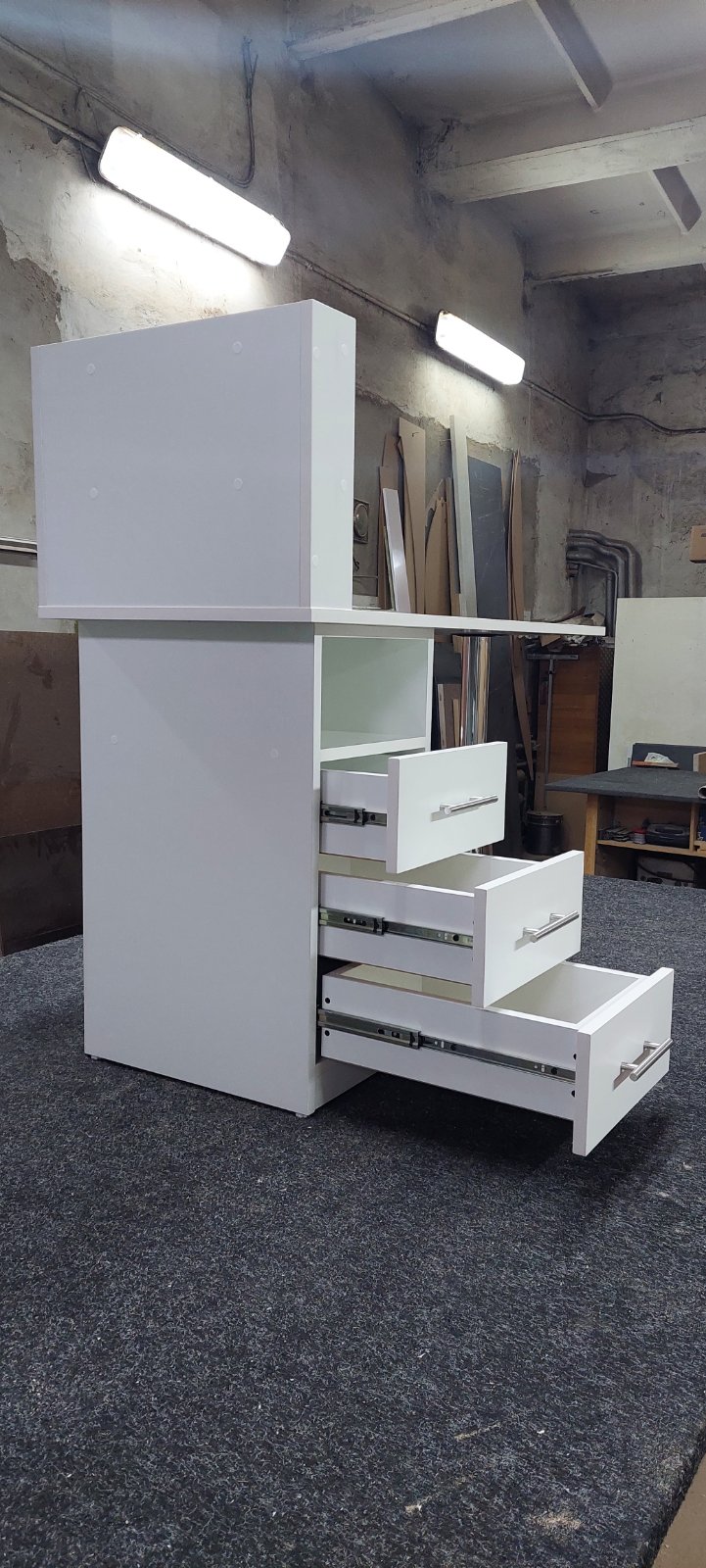 Две столешницы на разных уровнях. Выдвижные ящики. Угловая конструкция.