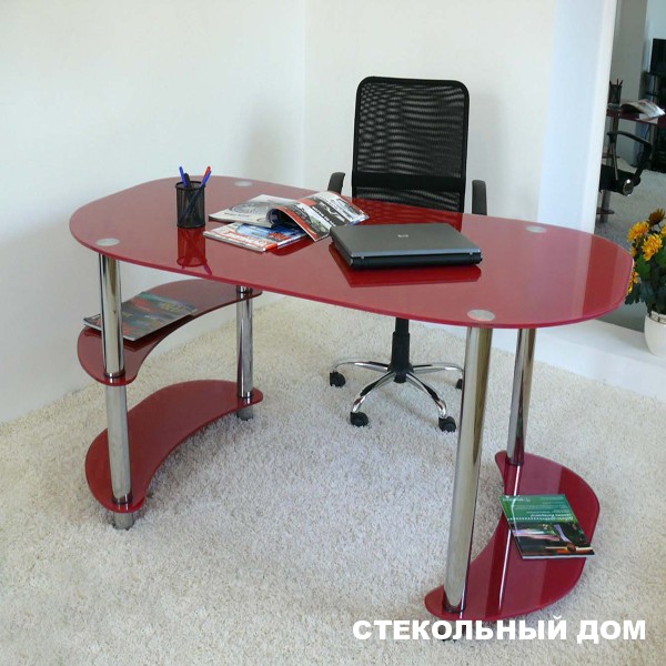 Современный письменный рабочий стол с овальной столешницей и дуговыми полками, крепящимися к хромированным круглым ножкам. Непрозрачный лакобель красного цвета изготовлен на основе толстого прочного стекла и прослужит достаточно долго при надлежащей эксплуатации. Сочетание глянцевых материалов создает оригинальную творческую деловую атмосферу и вдохновляет на новые успешные идеи.