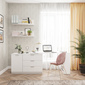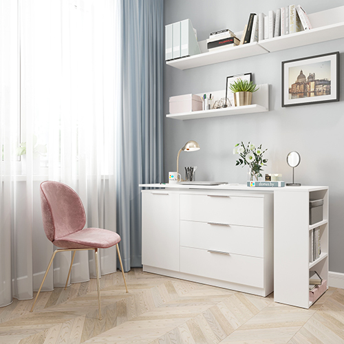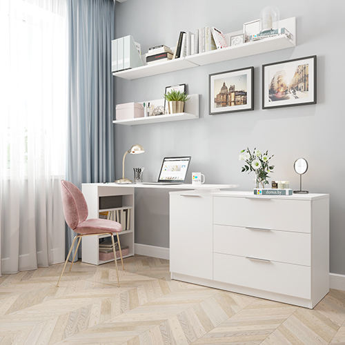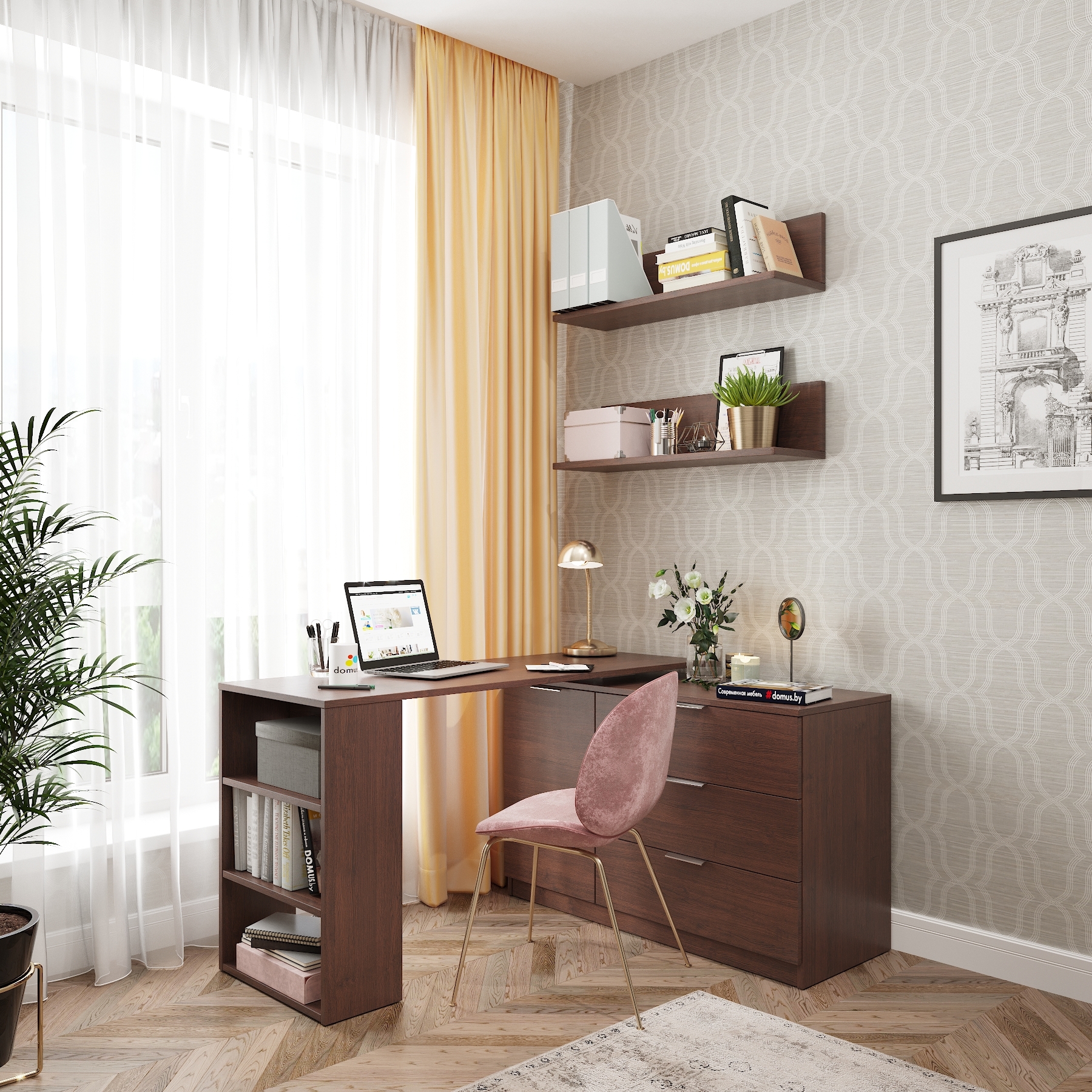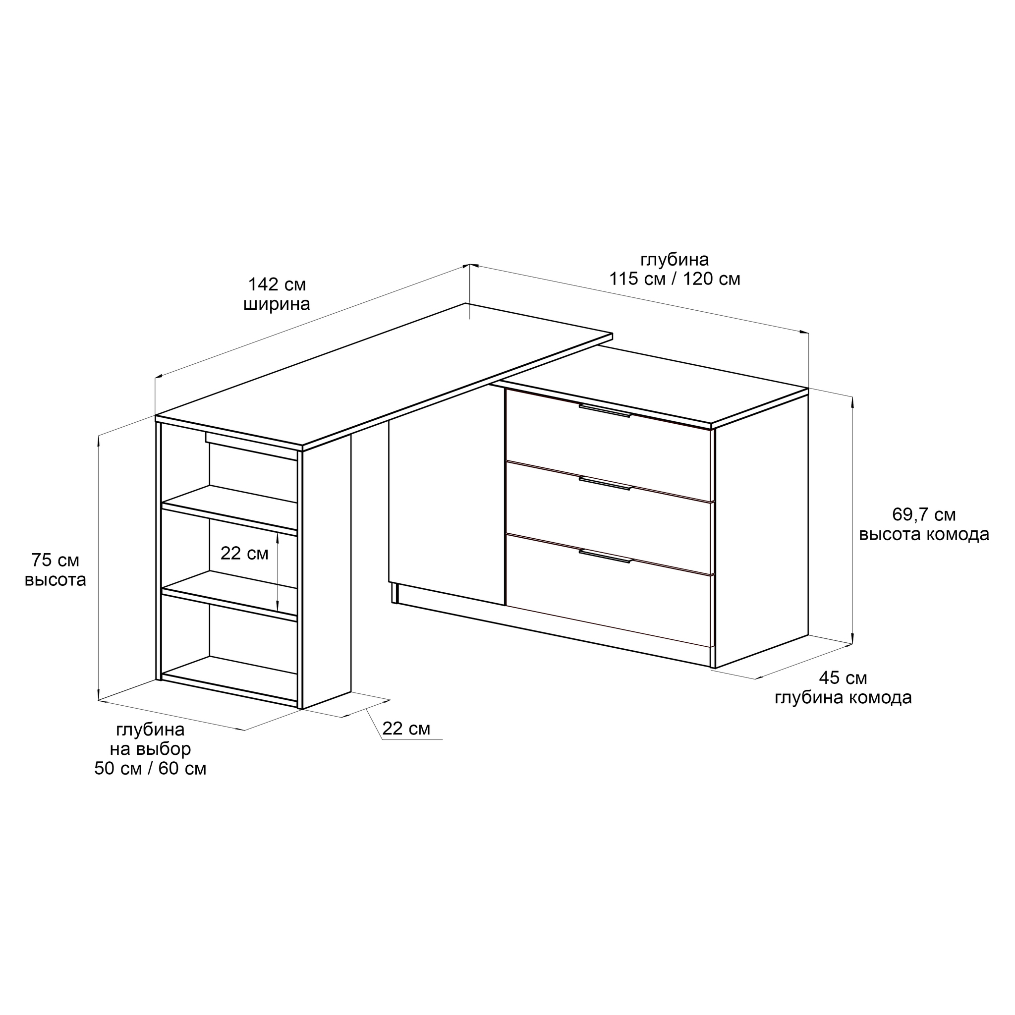 Стильная новинка – письменный стол-комод с поворотным модулем ДОМУС СТР06 оснащен удобной системой хранения вещей. Комод предусматривает 3 выдвижных ящика, шкафчик с распашной дверцей и полкой. Под столешницей есть три вместительные полки для книг и тетрадей. Такой универсальный стол отлично впишется в интерьер гостиной, детской или спальни. Столешница поворачивается на 360 градусов. Компактный стол-спинер в сложенном виде не занимает много места и по необходимости легко раскладывается в угловой или линейный. Можно использовать как туалетный столик.