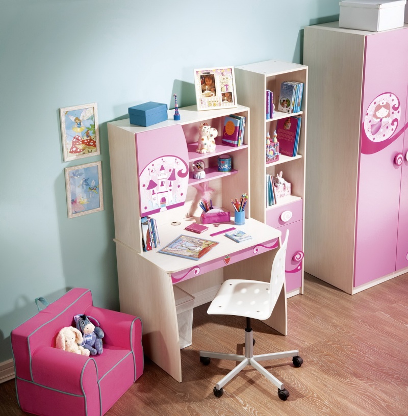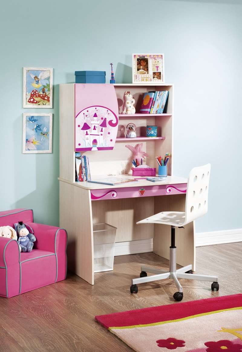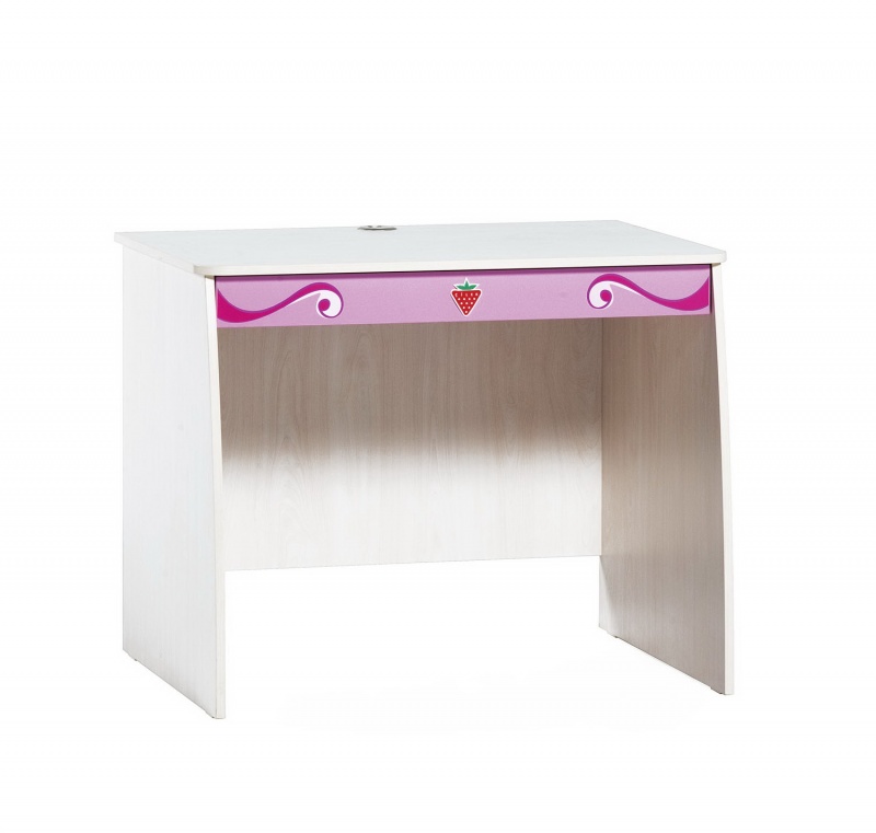 Письменный стол отличается компактными размерами и ярким декором на фасаде выдвижного ящика. Дополнительно можно приобрести надстройку с закрытым шкафчиком и открытыми книжными полками.