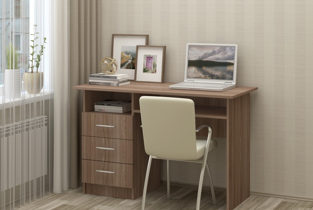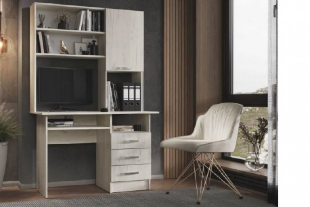 Небольшой компьютерный стол в комплекте с комодом и навесной полкой.
