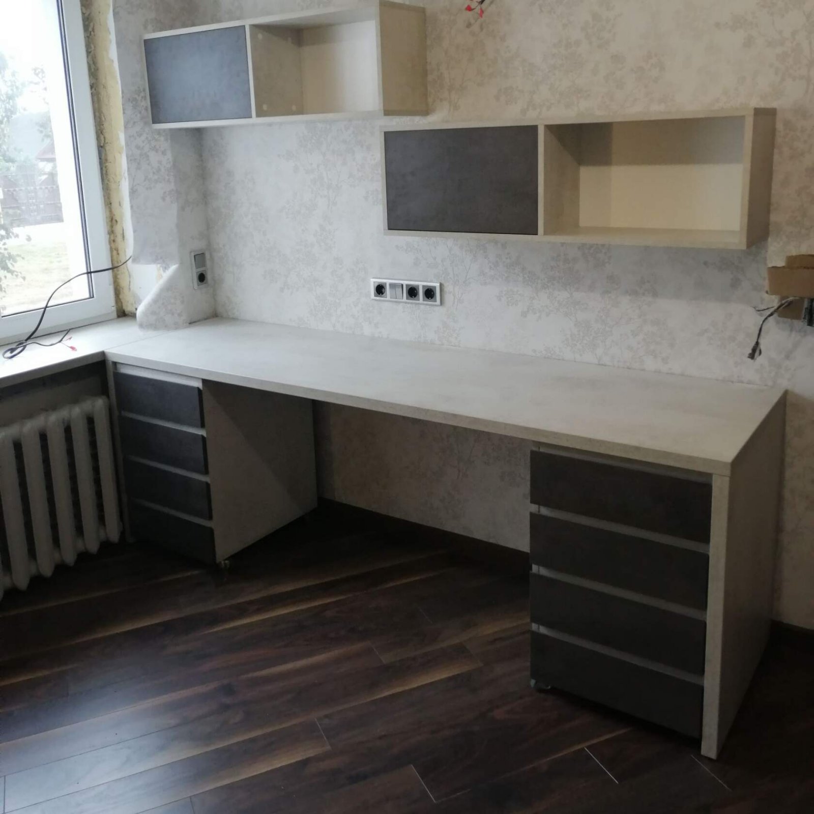код 113249Широкий стол с выдвижными ящиками и двумя навесными полками.