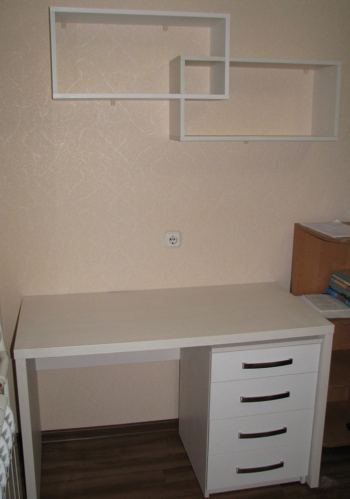 Представленный стол выполнен в белом цвете. Конструкция оснащается четырьмя выдвижными ящиками с хромированными ручками. В комплекте с представленной моделью были изготовлены аккуратные настенные полочки.