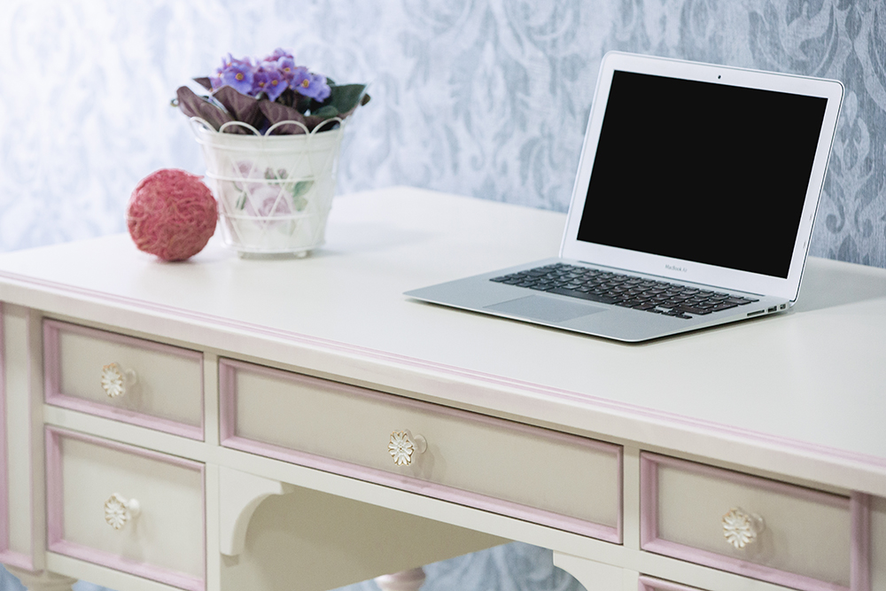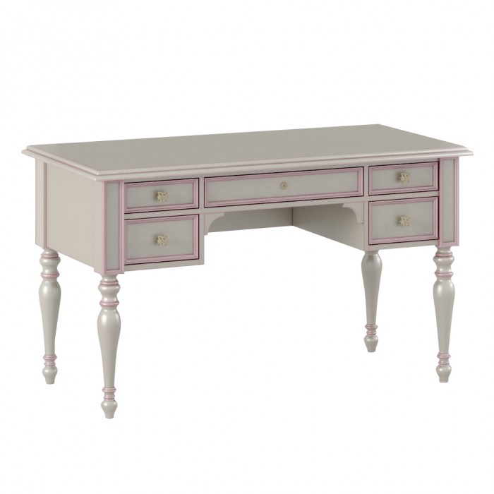 Белый консольный столик в оригинальном стиле. Под прямоугольной столешницей с фрезерованной кромкой располагаются широкая вместительная шуфляда посередине и по два небольших выдвижных ящика по краям. Светлый филенчатый корпус дополнен цветным декором и компактными ручками-кнопками в легкой патине. Стол для детской может быть использован, как трюмо с зеркалом или как место для учебы и прочих занятий.