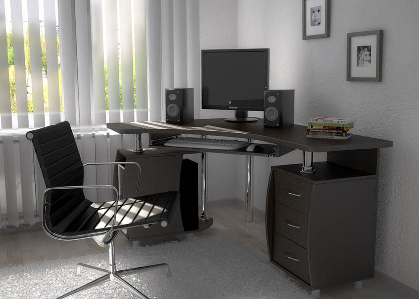 Светлый компьютерный стол угловой конструкции для дома или офиса.