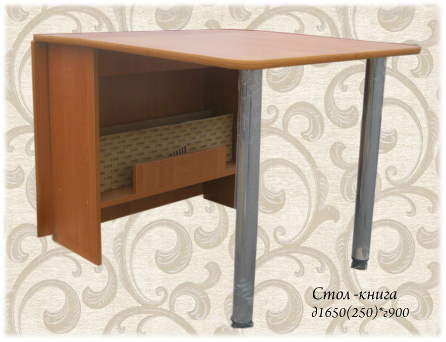 Стол-книга – это практичное решение для небольших комнат, поскольку в сложенном виде он практически не занимает места в комнате. Модель легко раскладывается, опорами служат металлические ножки. Столешница и корпус выполнены из ЛДСП.
