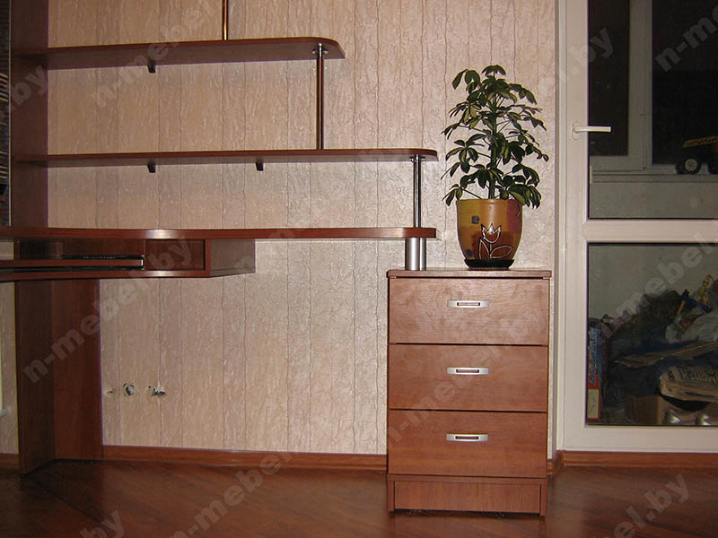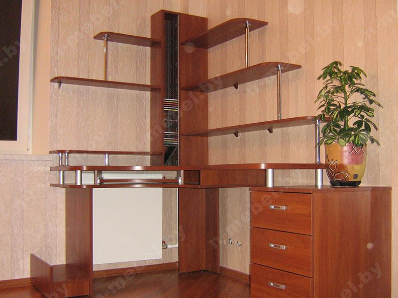 Современный компьютерный стол оснащен удобной тумбой с несколькими выдвижными ящиками. В комплекте также имеется полка для клавиатуры и специальная ниша для системного блока. Еще большую функциональность данной модели придают открытые полочки, зафиксированные на столешнице.