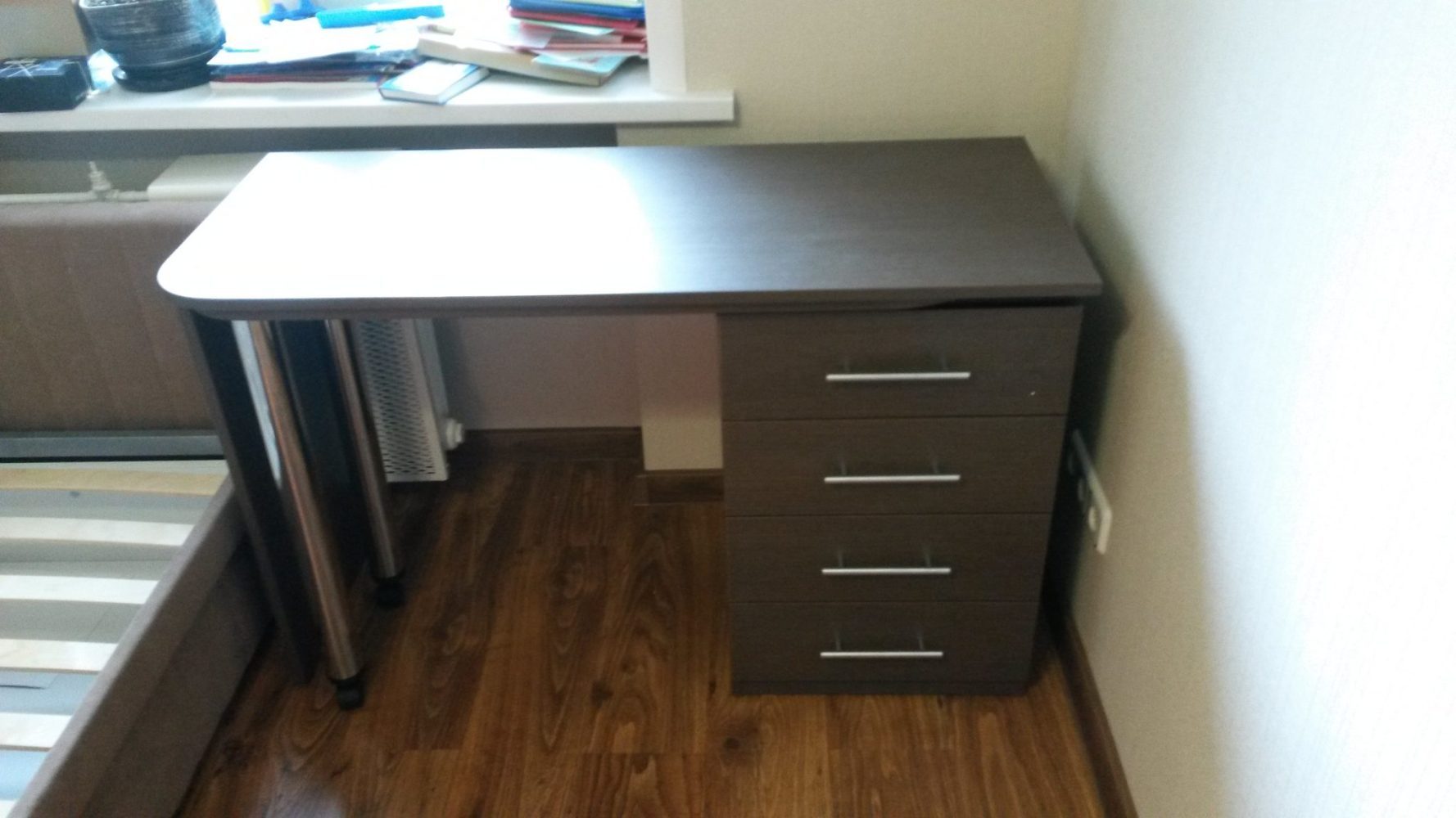 Практичный стол из ЛДСП с двумя полками на столешнице.