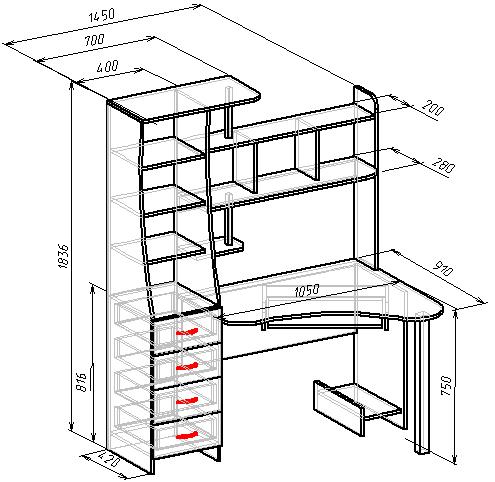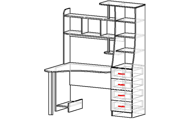 Под столешницей компьютерного стола установлена выдвижная полка для клавиатуры и мыши. Шкаф, оборудованный четырьмя вместительными ящиками, сохранит «под рукой» все самое необходимое. Выпускается в левом и правом исполнении.