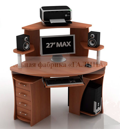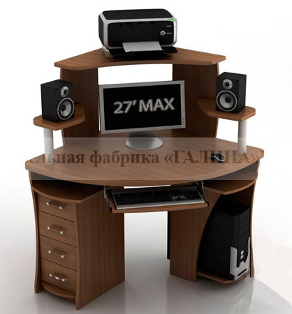 Прямой рабочий стол с закругленными углами. Корпус и столешница цвета венге, в контраст светлому фасаду тумбы.