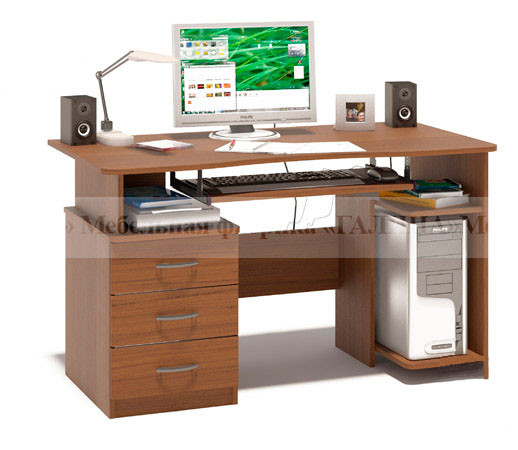 Стол оснащен тумбой с тремя ящиками и полкой под системный блок.