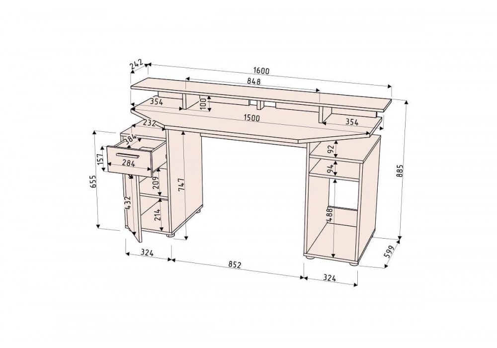 В комплект входит: 2 стеллажа, 2 навесные полки с Z4-фасадами, 2 угловых письменных стола.