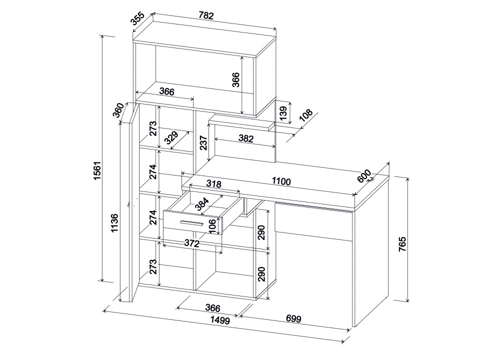 Открытая полка и выдвижной ящик на шариковых направляющих.