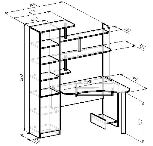 Конструкция стола, соединив воедино разноплановые функциональные элементы мебели, предлагает удобный и практичный рабочий уголок. Рабочая зона, с большой столешницей комфортно отгорожена от внешних «помех». Плодотворный труд обеспечивают - удобная надстройка и боковой шкаф с полками и нишей за дверью.